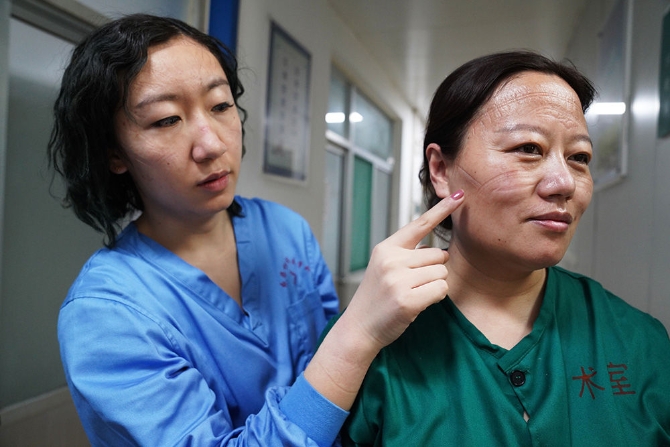 2020年1月28日,在山東省鄒平市人民醫(yī)院,醫(yī)護(hù)人員彭美麗(右)和鞏曉君把防護(hù)服脫掉后,臉上留下很深的勒痕。新華社發(fā)(董乃德攝)