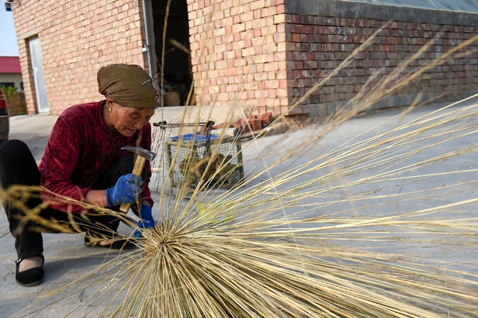 李耀梅在加固掃帚(2019年4月28日攝)。新華社發(fā)(馮開(kāi)華 攝)