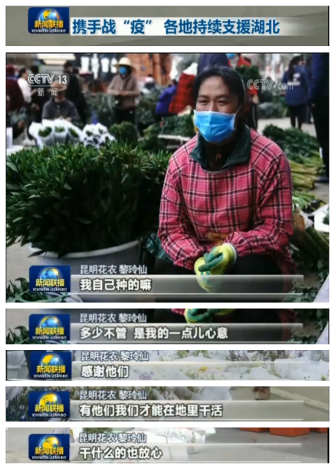 3月7日,央視《新聞聯(lián)播》節(jié)目播發(fā)了題為《凝心聚力 堅決奪取脫貧攻堅戰(zhàn)全面勝利——習(xí)近平總書記在決戰(zhàn)決勝脫貧攻堅座談會上的重要講話在各地引發(fā)強烈反響》《攜手戰(zhàn)“疫” 各地持續(xù)支援湖北》兩篇報道,其中的部分內(nèi)容分別介紹了云南怒江貢山縣脫貧攻堅以及云南昆明鮮花馳援湖北的情況。