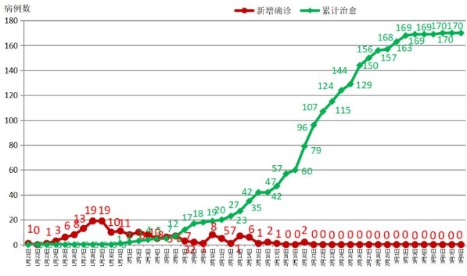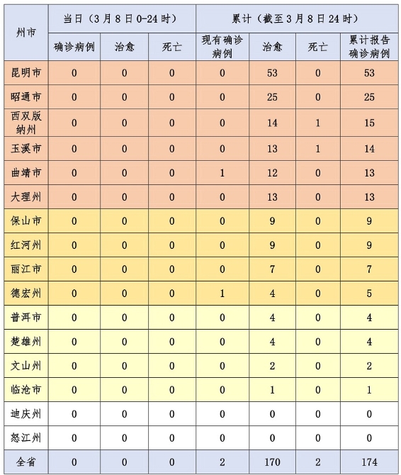 昆明信息港訊 機(jī)器人小明 3月8日12時(shí)至24時(shí),無(wú)新增確診病例。截至3月8日24時(shí),已連續(xù)17天新增病例為0,全省累計(jì)確診病例174例,治愈出院170例,死亡2例,現(xiàn)有確診病例2例,無(wú)重癥、危重癥病例。