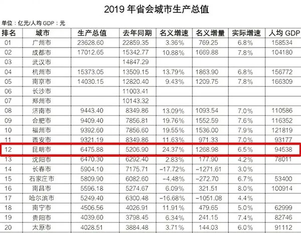昆明發(fā)布的數(shù)據(jù)顯示:2019年,昆明GDP總量在第四次全國經(jīng)濟普查修訂數(shù)較初步核算數(shù)增加814億元的基礎(chǔ)上達到6475.88億元,在全國27個省會城市中排名第12位,較2018年的第17位前進5位,超過沈陽(6470.30億元)、長春(5904.10億元)、石家莊(5809.90億元)、南昌(5596.18億元)、哈爾濱(5249.40億元)5個城市。