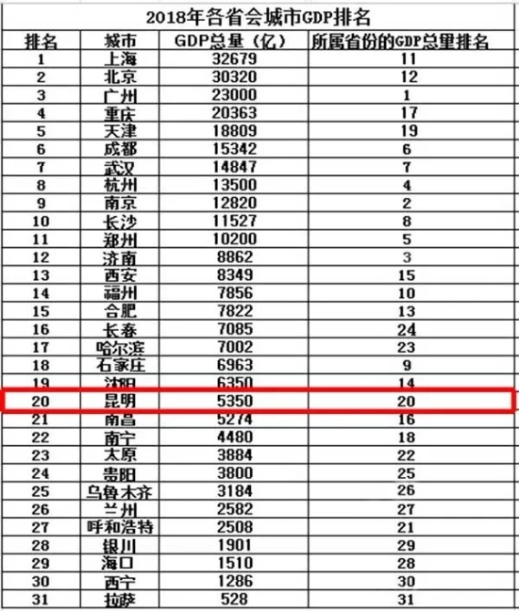 時間回溯到2010年,當時昆明的GDP是1808億元,在全國城市中排名53位,而當時南昌(1820億元)排第52位,面對排名第27位的長春(2919億元)、排名第25位的石家莊(3110億元)、排名第30位的西安(2719.1億元),只能仰望,更別提排名第15位的沈陽(4350億元)了。