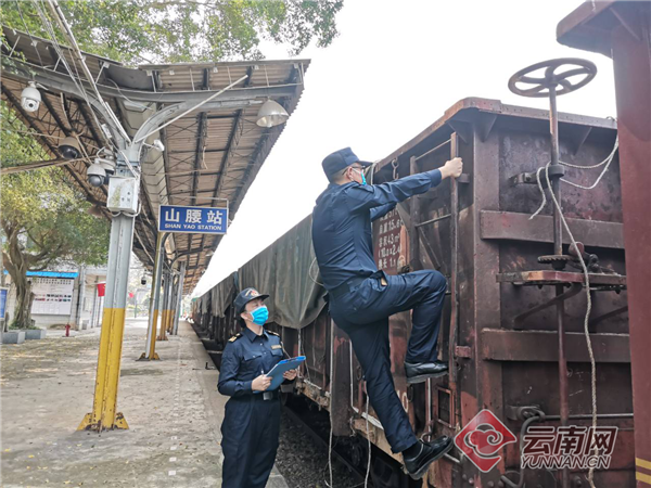 昆明海關(guān)關(guān)員對(duì)列車進(jìn)行登臨檢查。昆明海關(guān)供圖