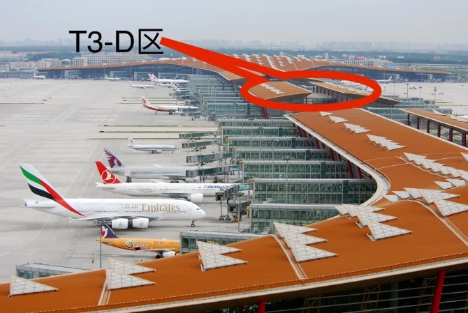 在這里跟大家說明一下。T3-D是相對獨立的一個樓,大家以往在三號樓乘坐飛機的時候,偶爾會遇到即使是國內(nèi)航班也要搭乘小火車才能出發(fā),這時候到達(dá)的就是T3-D的這個區(qū)域了。