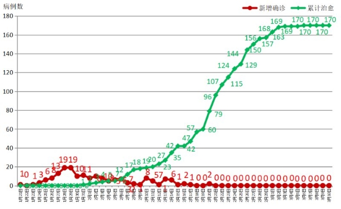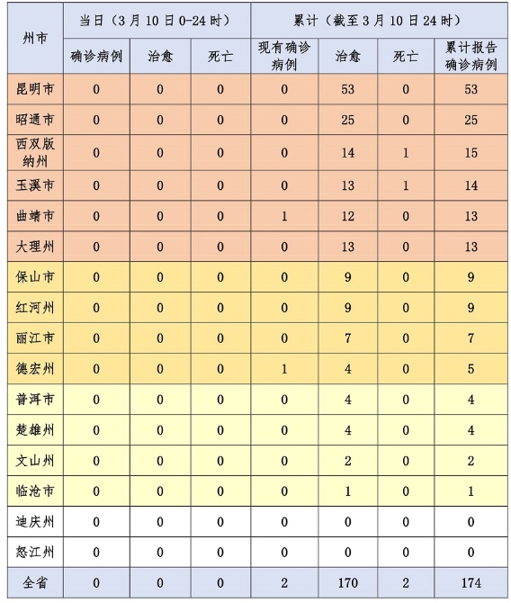 昆明信息港訊 機器人小明 3月10日12時至24時,無新增確診病例。截至3月10日24時,已連續(xù)19天新增病例為0,全省累計確診病例174例,治愈出院170例,死亡2例,現(xiàn)有確診病例2例,無重癥、危重癥病例。