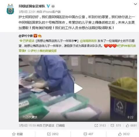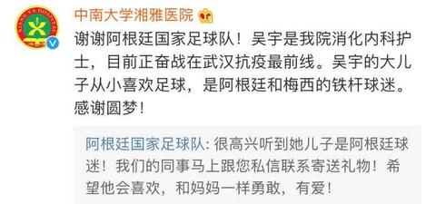 9日上午,中南大學(xué)湘雅醫(yī)院官微在阿根廷國(guó)家足球隊(duì)官微下方留言并表示感謝。隨后,阿根廷國(guó)家足球隊(duì)官微回復(fù),他們會(huì)馬上與湘雅醫(yī)院聯(lián)系寄送禮物!“希望他會(huì)喜歡,和媽媽一樣勇敢,有愛(ài)!”