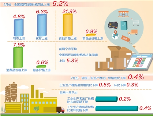 3月10日,國家統(tǒng)計(jì)局公布了2月份全國居民消費(fèi)價(jià)格指數(shù)(CPI)和工業(yè)生產(chǎn)者出廠價(jià)格指數(shù)(PPI)數(shù)據(jù)。2月份,CPI同比上漲5.2%,漲幅比上月回落0.2個(gè)百分點(diǎn);PPI同比下降0.4%。