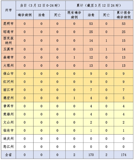昆明信息港訊 機器人小明 3月12日12時至24時,無新增確診病例。截至3月12日24時,已連續(xù)21天新增病例為0,全省累計確診病例174例,治愈出院170例,死亡2例,現(xiàn)有確診病例2例,無重癥、危重癥病例。