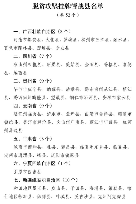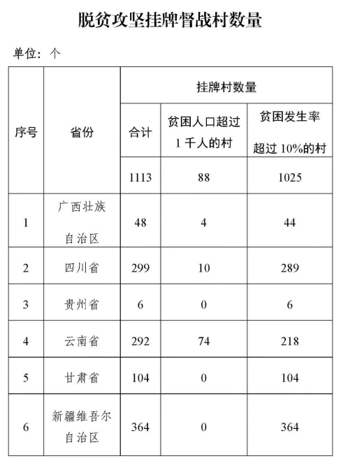 2019年底,習(xí)近平總書記作出對(duì)工作難度大的縣和村掛牌督戰(zhàn)的重要指示。2020年1月25日,國(guó)務(wù)院扶貧開(kāi)發(fā)領(lǐng)導(dǎo)小組印發(fā)《關(guān)于開(kāi)展掛牌督戰(zhàn)工作的指導(dǎo)意見(jiàn)的通知》,明確對(duì)“2019年底,未摘帽的52個(gè)貧困縣”“貧困人口超過(guò)1千人的88個(gè)村和貧困發(fā)生率超過(guò)10%的1025個(gè)村,共1113個(gè)村”開(kāi)展掛牌督戰(zhàn)工作。國(guó)家掛牌縣、掛牌村集中在廣西、四川、貴州、云南、甘肅、寧夏和新疆7個(gè)省區(qū)。各省區(qū)可結(jié)合本地實(shí)際,在國(guó)家掛牌督戰(zhàn)范圍的基礎(chǔ)上,自行確定一批工作難度大的縣和村。