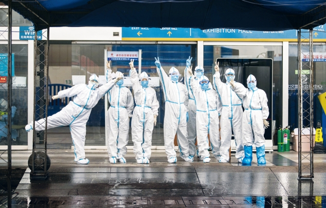 2020年3月10日,隨著武昌方艙醫(yī)院的醫(yī)護人員送走最后一批康復出院的新冠肺炎輕癥患者,武漢市方艙醫(yī)院全部完成使命,宣布休艙。圖為江漢方艙醫(yī)院的醫(yī)療隊員出艙后合影。新華社 記者 費茂華/攝