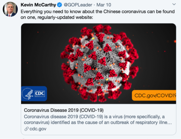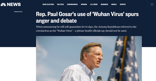 3月10日,美國(guó)眾議院少數(shù)黨領(lǐng)袖凱文·麥卡錫在社交媒體上使用“中國(guó)冠狀病毒”一詞。此前,美國(guó)??怂剐侣勁_(tái)主持人杰西·沃特斯公然要求中國(guó)人為新冠肺炎疫情“正式道歉”。美國(guó)國(guó)務(wù)卿蓬佩奧在接受媒體采訪時(shí)多次將新型冠狀病毒稱為“武漢病毒”。由于曾與一位確診人士有過(guò)接觸,美國(guó)眾議院議員保羅·戈薩拉3月8日在社交媒體上宣布將自我隔離14天,他將新冠病毒再次稱為“武漢病毒”。