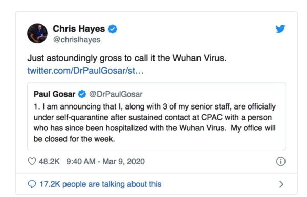 對(duì)于戈薩拉在推文中提到“武漢病毒”一事,微軟全國(guó)廣播公司節(jié)目(MSNBC)主持人克里斯·海耶斯(Chris Hayes)在社交媒體直呼:“這種說(shuō)法令人感到惡心?!?/p>