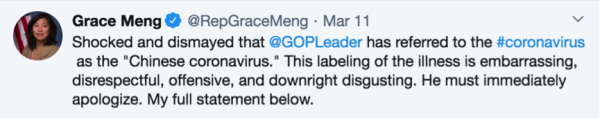 美國(guó)民主黨籍國(guó)會(huì)眾議員孟昭文要求麥卡錫道歉,并指責(zé)他的這一舉動(dòng)是“尋找替罪羊和政治權(quán)宜伎倆”。她說(shuō):“給疾病貼標(biāo)簽令人蒙羞、粗魯無(wú)禮、令人作嘔,這非常無(wú)恥。”