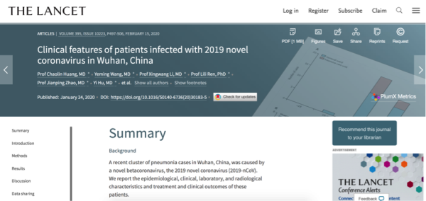 1月24日,《柳葉刀》網(wǎng)絡(luò)版發(fā)表了一篇由武漢市金銀潭醫(yī)院黃朝林等7名臨床醫(yī)生參與的《中國(guó)武漢2019新型冠狀病毒感染者的臨床特征》研究論文,論文的研究對(duì)象是最初被收治的41例新冠肺炎病例。研究顯示,首名感染新型冠狀病毒患者出現(xiàn)癥狀的日期是2019年12月1日,該病例無(wú)華南海鮮市場(chǎng)暴露史,其家人也未出現(xiàn)發(fā)熱和呼吸道癥狀。