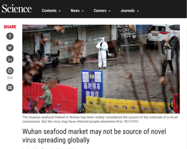《科學(xué)》雜志1月26日發(fā)表一篇題為《武漢華南海鮮市場(chǎng)可能并非新型冠狀病毒發(fā)源地》文章。文中援引美國(guó)喬治敦大學(xué)傳染病專家丹尼爾·盧西(Daniel Lucey)觀點(diǎn):“13個(gè)人和這個(gè)市場(chǎng)沒(méi)有任何聯(lián)系。這不是個(gè)小數(shù)字?!彼J(rèn)為,如果數(shù)據(jù)真實(shí)準(zhǔn)確,那么最早的感染可能發(fā)生在去年11月。因?yàn)樵诟腥竞桶Y狀出現(xiàn)之間有一段潛伏期。他表示如果是這種情況,新型冠狀病毒最初可能源自其他地方,在人群中悄無(wú)聲息地傳播,12月下旬出現(xiàn)華南海鮮批發(fā)市場(chǎng)的大量病例。