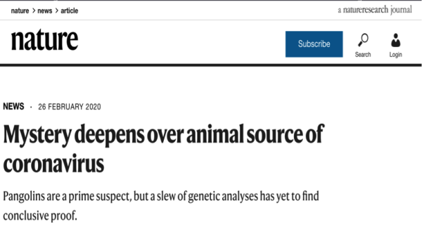 2月26日《自然》雜志發(fā)布一篇題為《新冠病毒的動(dòng)物來(lái)源說(shuō)法仍迷霧重重》的文章。文章指出,穿山甲有可能是中間宿主,但從大量的遺傳學(xué)分析角度尚未找到確鑿的證據(jù)作支撐。
