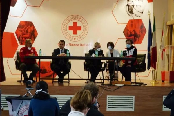 △圖為援意中國抗疫醫(yī)療專家組舉行當?shù)孛襟w見面會 圖片來源/意大利紅十字會