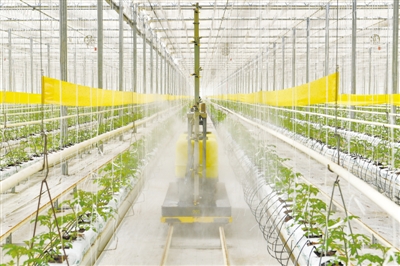 初春時節(jié),山西農業(yè)大學為山西省晉中市太谷區(qū)范村鎮(zhèn)格子頭村引進自動噴藥機、病蟲害物理防治系統(tǒng)、水肥一體化系統(tǒng),有效提高了生產效率,幫助農民增收致富。圖為近日,自動噴藥機在格子頭村的玻璃溫室大棚內為西紅柿苗噴灑農藥。新華社 記者曹陽/攝