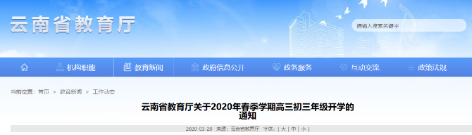 3月20日,記者從云南省教育廳網(wǎng)站獲悉,云南省教育廳今日發(fā)布《關(guān)于2020年春季學(xué)期高三初三年級開學(xué)的通知》(以下簡稱《通知》),對初三高三年級開學(xué)時間、報到及校園防控工作做出具體要求。