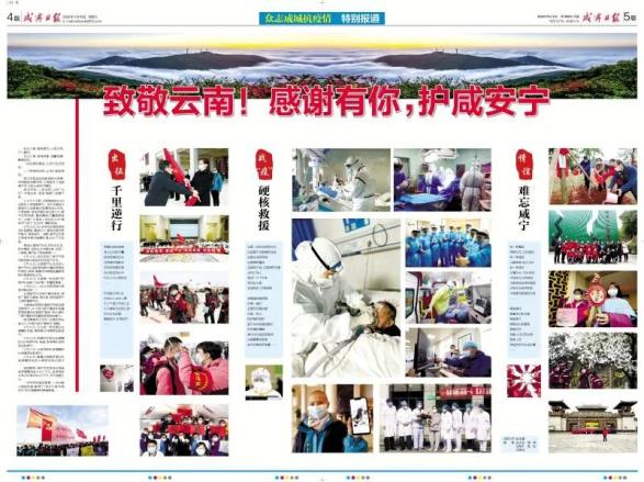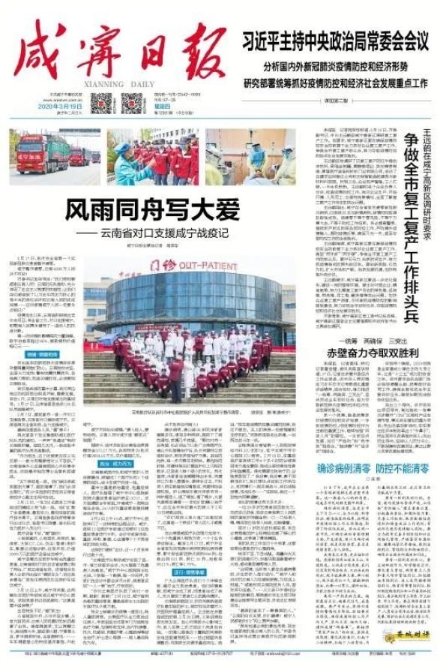 3月19日《咸寧日?qǐng)?bào)》的6個(gè)整版,先是封面以《風(fēng)雨同舟寫(xiě)大愛(ài)》為主題的通訊,記錄了云南醫(yī)療隊(duì)咸寧戰(zhàn)“役”的過(guò)程,從云南傾囊相助的馳援,到云南醫(yī)療隊(duì)傾力救治病人,再到記錄著云南醫(yī)療隊(duì)員溫暖點(diǎn)滴的故事……