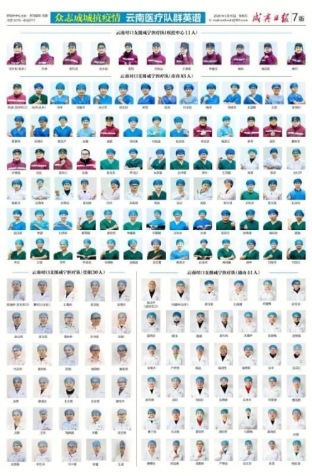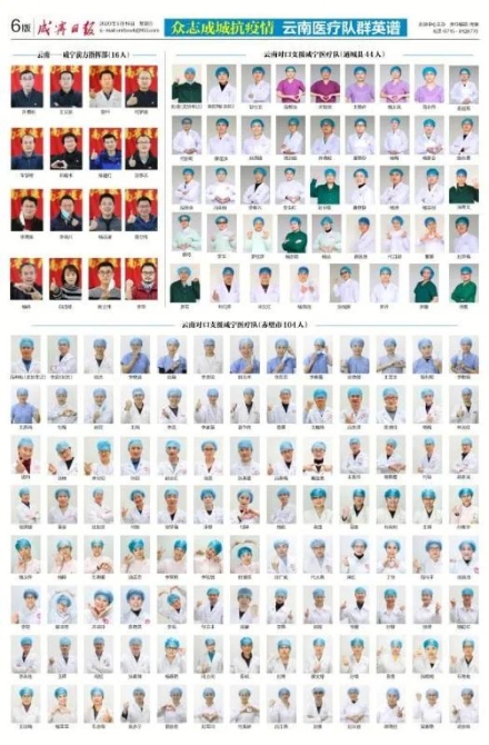 “致敬云南!感謝有你,護(hù)咸安寧。”3月18日,在云南醫(yī)療隊(duì)即將離開(kāi)咸寧之際,《咸寧日?qǐng)?bào)》用一種特殊的方式,記錄了云南醫(yī)療隊(duì)員的容貌。他們用了6個(gè)整版刊登了498名云南醫(yī)療隊(duì)員摘下口罩時(shí)的頭像,讓咸寧人民終于看見(jiàn)云南醫(yī)療隊(duì)員的容顏,也記住了云南醫(yī)療隊(duì)員的容顏……