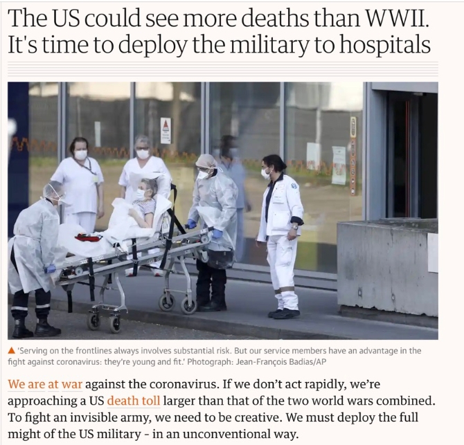 19日,來自哈佛大學(xué)、麻省理工大學(xué)和加州大學(xué)圣地亞哥分校的三位美國(guó)學(xué)者在英國(guó)《衛(wèi)報(bào)》發(fā)文說:“我們正在與新冠病毒作戰(zhàn)。如果我們不迅速采取行動(dòng),美國(guó)的死亡人數(shù)將超過兩次世界大戰(zhàn)死亡人數(shù)的總和?!?/p>