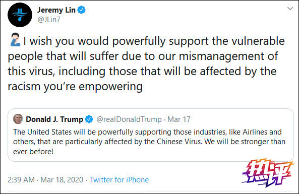 當(dāng)?shù)貢r間17日,美國總統(tǒng)特朗普公然將肆虐全球的新型冠狀病毒稱作“中國病毒”,試圖甩鍋中國以擺脫美國內(nèi)對其抗疫不力的指責(zé)。特朗普的無底線言論,引起海外華僑華人的堅(jiān)決反對,前NBA華裔球星林書豪也連發(fā)數(shù)條推文批評特朗普的表態(tài)帶有種族歧視含義,指責(zé)美國現(xiàn)任政府的防疫工作開展不力。
