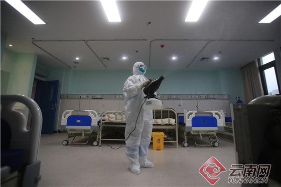云南省第五批援助湖北省醫(yī)療隊隊員對病房進行消殺。陳飛/攝