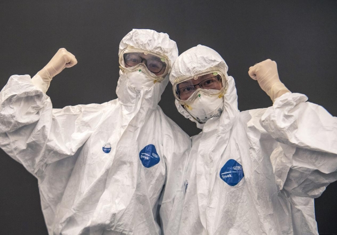 2020年1月26日,穿戴好防護(hù)裝備的上海醫(yī)療隊(duì)隊(duì)員錢曉(左)、文佳(右)為武漢加油。當(dāng)天,來自上海醫(yī)療隊(duì)的首批醫(yī)務(wù)人員進(jìn)入武漢市金銀潭醫(yī)院隔離病房,開始輪替值班接手治療新冠肺炎病人。湖北日報(bào)全媒記者 魏錸/攝