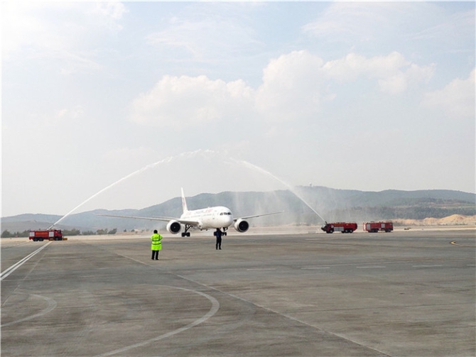 隨即,兩輛消防車在飛機(jī)兩側(cè)噴出“水門”,為白色勇士“接風(fēng)洗塵”,以最隆重的禮遇迎接白衣戰(zhàn)士回家。