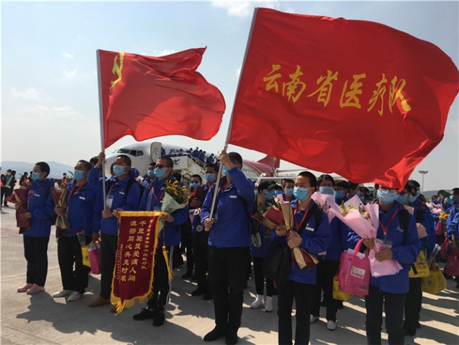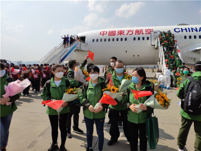 白衣披甲,寸心報(bào)國;云嶺花開,英雄凱旋。隨著陽光和春風(fēng),迎著鮮花和掌聲,醫(yī)療隊(duì)員步出艙門,走下舷梯,踏上云嶺大地,擁抱家鄉(xiāng)陽光。