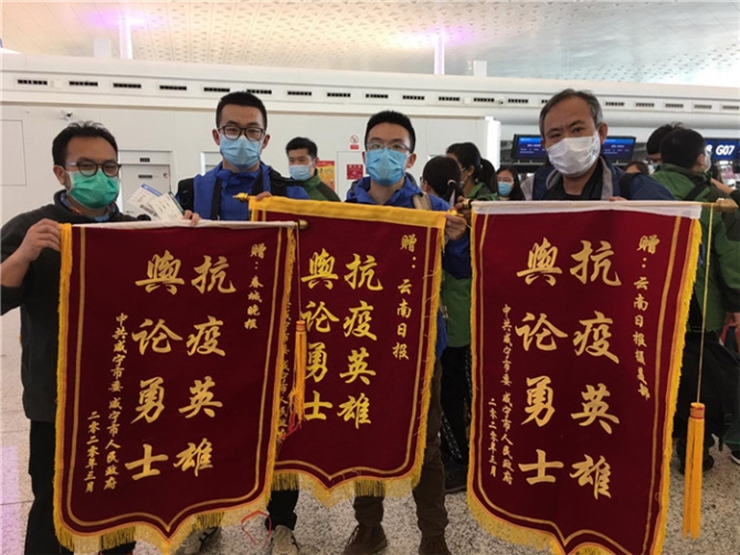 “抗疫英雄、輿論勇士?!碑?dāng)天,帶著咸寧市委、市政府贈送的錦旗歸來,云南日報(bào)報(bào)業(yè)集團(tuán)、云南廣播電視臺8名記者與醫(yī)療隊(duì)一同歸來。