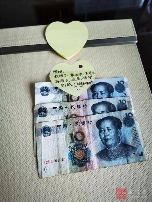 來自曲靖市中醫(yī)醫(yī)院的一位隊員,用了一條毛巾,留下三張十元人民幣,并用便利貼寫著:“阿姨,我用了一條毛巾,不可以再用了,這是賠償?shù)腻X!”