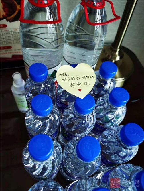 一位隊員留下了十多瓶礦泉水,并寫道:阿姨,剩下的水,給你吧,謝謝你!