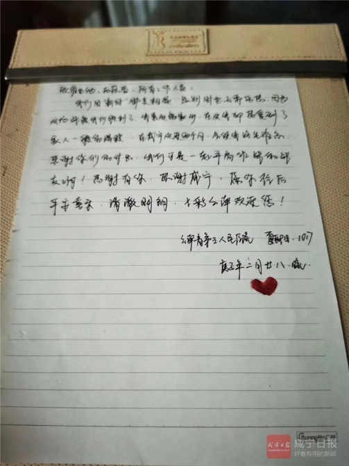 醫(yī)療隊隊員夏亞陽給維也納志愿者、所有工作人員留下一封信:我們因新冠肺炎相遇,離別時也無需傷感。因為這場戰(zhàn)疫我們勝利了。我雖遠離家鄉(xiāng),在這里卻感受到了家人一般的溫暖。在咸寧這近兩個月,會使我終生難忘,感謝你們的付出,我們科室一起并肩作戰(zhàn)的戰(zhàn)友啊!感謝有你,感謝咸寧,愿往后平安喜樂、清澈明朗,七彩云南歡迎您!
