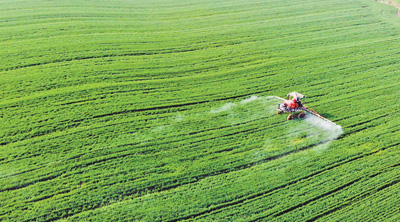 日前在湖北省襄陽(yáng)市高新技術(shù)產(chǎn)業(yè)開(kāi)發(fā)區(qū)李沖村,大型植保機(jī)械在麥田噴灑農(nóng)藥和葉面肥。安富斌攝(影像中國(guó))