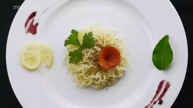 非常喜歡把泡面做出米其林三星的感覺:在放好調(diào)料的沸水中把泡面煮開,瀝干水分擺好盤,配上臘腸和香芹葉,一盤歐氣滿滿的“法式卷面”就大功告成了!