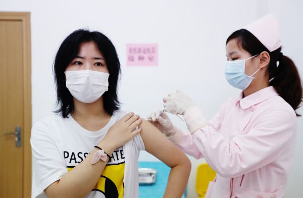 19歲的志愿者秦媛媛接種重組新型冠狀病毒(2019-COV)疫苗?。▓D片來源:武漢晚報)