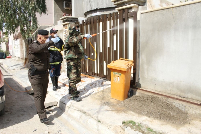 3月8日,在伊拉克北部基爾庫克省,醫(yī)療人員為新冠肺炎確診病例所在家庭的房屋消毒。新華社發(fā)