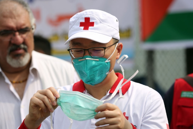 3月16日,在伊拉克巴格達(dá),中國醫(yī)療專家展示口罩使用方法。新華社發(fā)