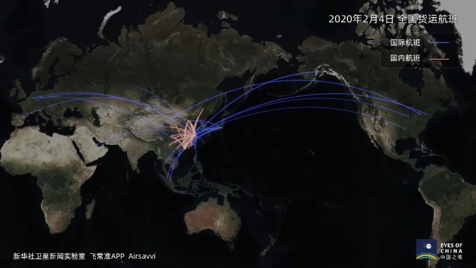 1個月內(nèi),中國國內(nèi)和直飛世界各地的貨運航班快速增多,原有航線航班數(shù)也有增加,標示航線的橘色、藍色線條也就更粗。