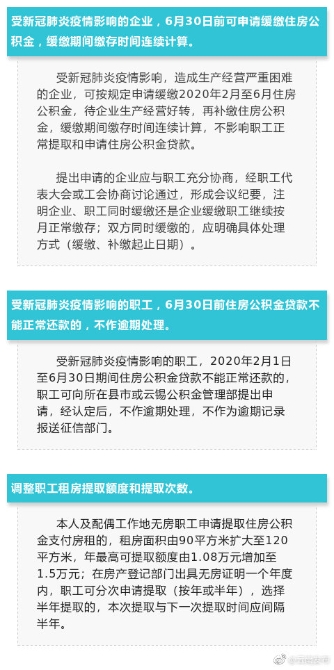 昆明信息港訊 機器人小明 【職工租房提取額度和次數(shù)有調(diào)整!紅河州出臺住房公積金階段性支持政策】近日,紅河州出臺了住房公積金階段性支持政策。根據(jù)政策,受新冠肺炎疫情影響,造成生產(chǎn)經(jīng)營嚴(yán)重困難的企業(yè),可按規(guī)定申請緩繳2020年2月至6月住房公積金,待企業(yè)生產(chǎn)經(jīng)營好轉(zhuǎn),再補繳住房公積金,緩繳期間繳存時間連續(xù)計算,不影響職工正常提取和申請住房公積金貸款。(紅河州委宣傳部)
