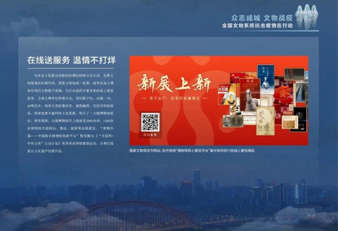 閉館不閉展、溫情不打烊、文物系荊楚、祝福頌祖國……回望文物系統(tǒng)在疫情防控阻擊戰(zhàn)中的作為與擔(dān)當(dāng),點點滴滴,匯聚成“眾志成城文物戰(zhàn)疫——全國文物系統(tǒng)抗擊疫情在行動”展覽。