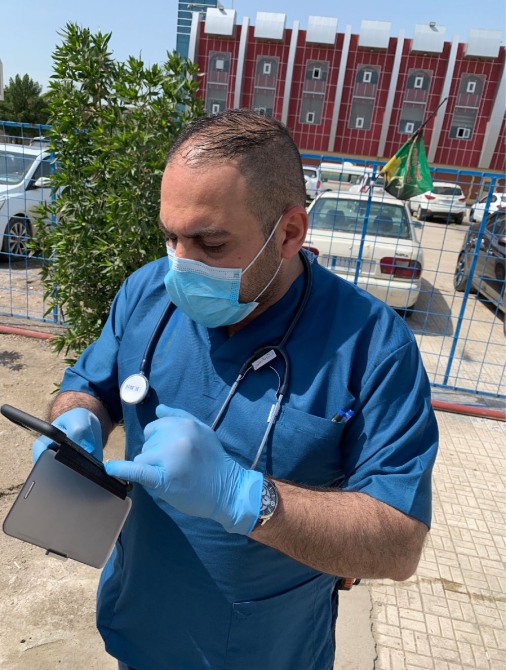 3月24日,在巴格達(dá)新冠肺炎定點(diǎn)隔離與收治醫(yī)院,新華社記者(左一)、中國專家組和當(dāng)?shù)蒯t(yī)生合影。圖片由專家組提供