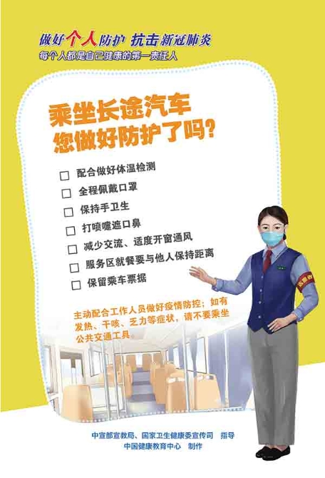 乘坐列車、飛機(jī)、地鐵等公共交通時(shí),注重個(gè)人防護(hù)是關(guān)鍵。我們需要全程佩戴口罩,隨時(shí)配合工作人員做體溫檢測(cè)。保持手的衛(wèi)生,在打噴嚏時(shí)需遮住口鼻,避免飛沫傳播。選擇“分散坐、少交流”的模式乘坐公共交通,下車后需及時(shí)洗手。需要注意的是,在乘坐出租車時(shí),要適度開窗通風(fēng),下車前索要發(fā)票;乘坐長(zhǎng)途汽車時(shí),在服務(wù)區(qū)就餐要與他人保持距離,并保留乘車票據(jù)。如出現(xiàn)發(fā)熱、干咳、乏力等癥狀,請(qǐng)不要乘坐公共交通工具。