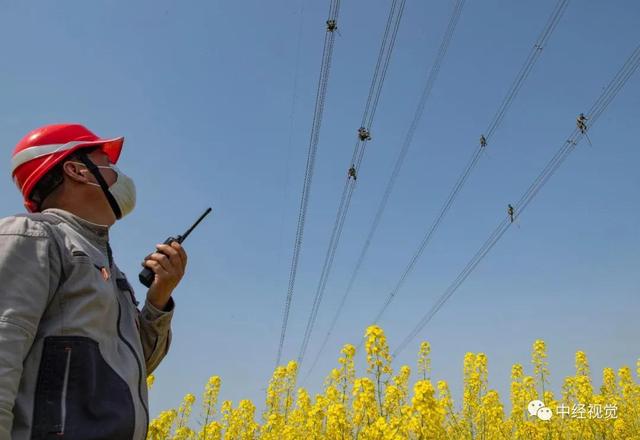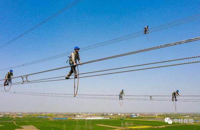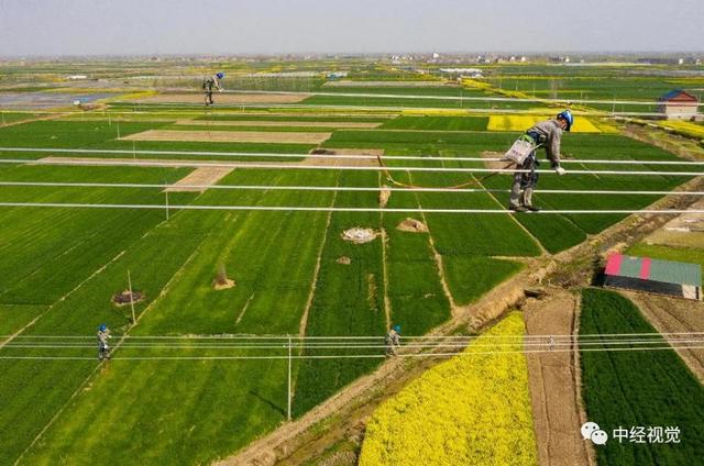 △ 3月20日,安徽省阜陽市潁上縣潤河鎮(zhèn),安徽送變電工程有限公司施工人員在60多米高的500千伏輸電導(dǎo)線上進(jìn)行走線施工。