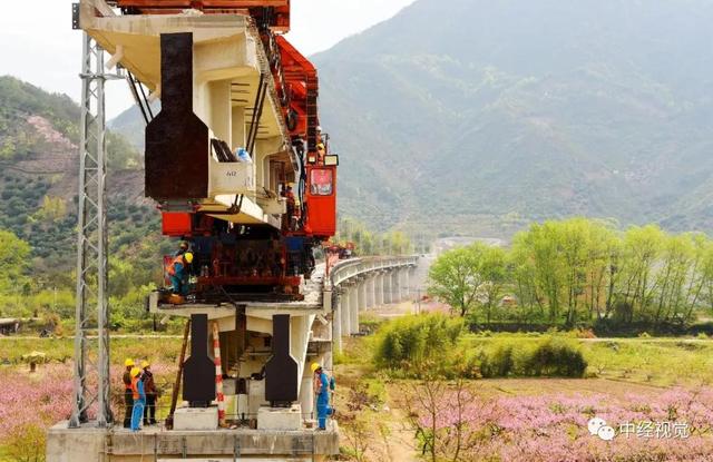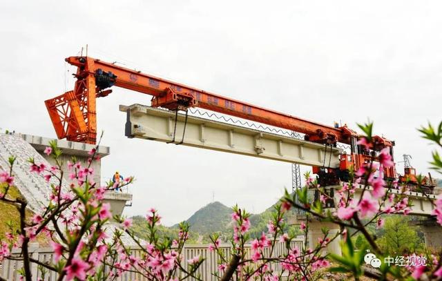 △3月24日,金臺(tái)鐵路臺(tái)州仙居括蒼河大橋工地,工人們通過架橋機(jī)正在安裝最后一孔梁。