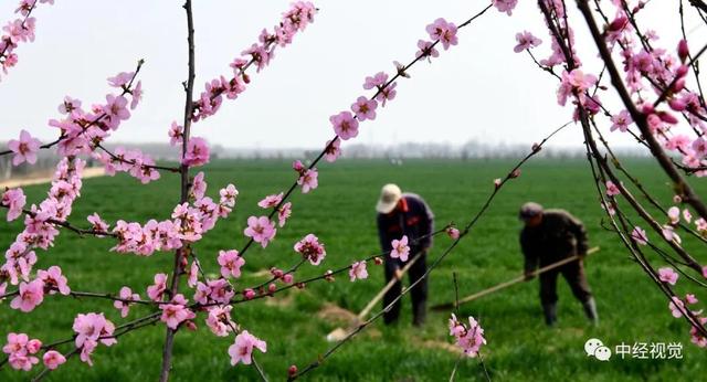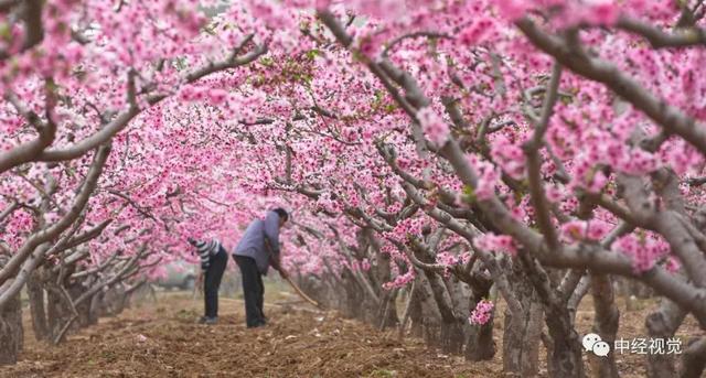 △3月23日,在河北省石家莊市欒城區(qū)柳林屯村田地里,兩名農(nóng)民正在桃花映襯下的田間勞作,一派世外桃源的景象。