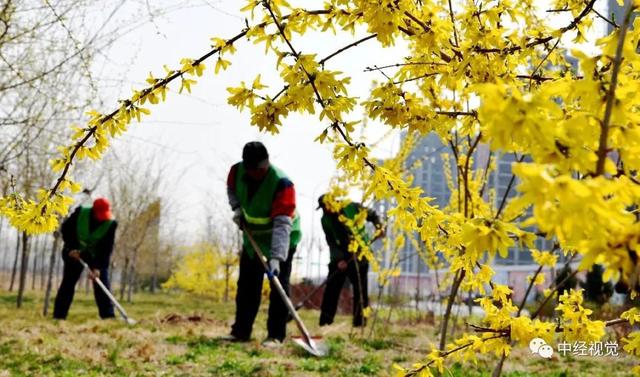 △3月23日,幾名工人在河北省石家莊市欒城區(qū)柴武大家的綠化帶連翹花下勞作。