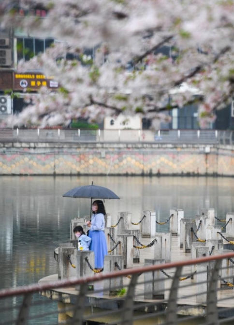 3月25日,在武漢西北湖,市民帶著孩子賞花。新華社記者 陳曄華 攝